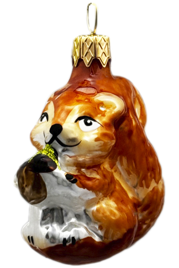 Белочка выполнена из стекла, декорирована росписью. Украшение для удобства имеет ушко для ниточки или крючка. В индивидуальной упаковке. Размер 5 см.