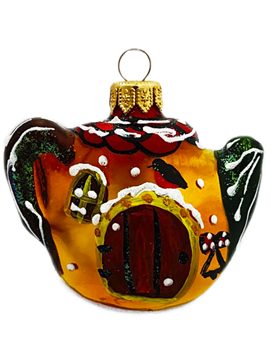 Фигурка из стекла Чайничек декорирована ручной росписью и переливающейся крошкой. Размер 7 см. Украшение для удобства имеет ушко для ниточки или крючка. В индивидуальной подарочной упаковке.