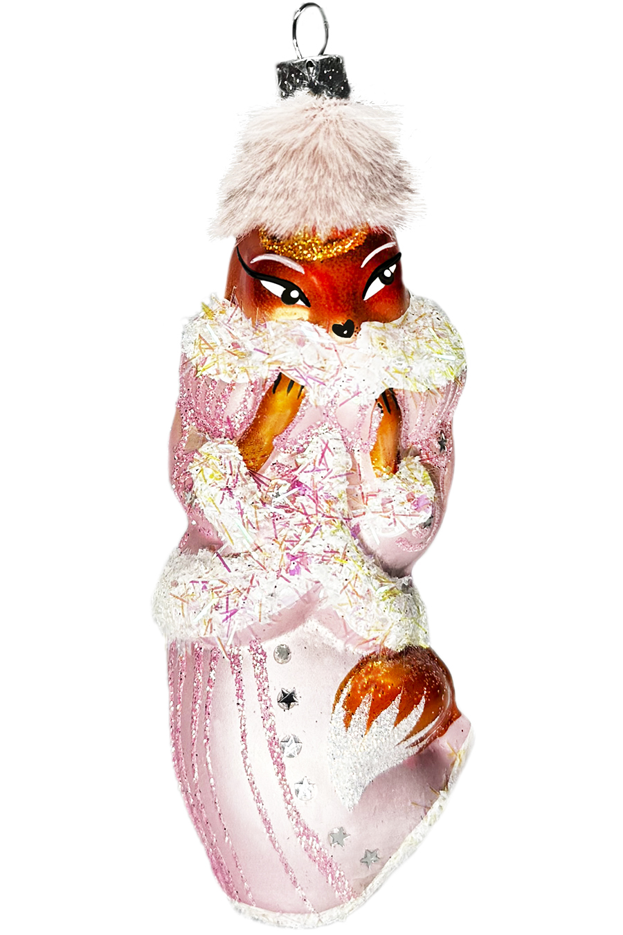 Лисичка выполнена из стекла, декорирована ручной росписью, снежной слюдой и глиттером. В индивидуальной упаковке.  Размер 12см. В ассортименте.