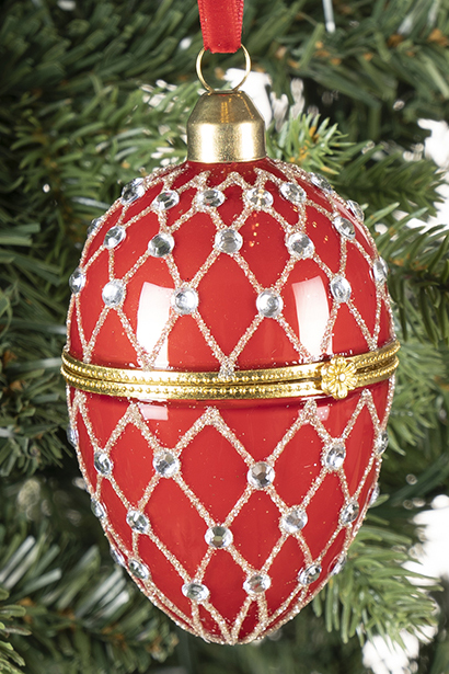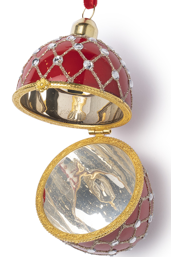 Стеклянное яйцо-шкатулка ярко-красного цвета напоминает знаменитые пасхальные яйца Фаберже. Покрытая золотистой сеткой и украшенная прозрачными стразами, ёлочная игрушка выглядит как настоящая драгоценность, внутри которой может храниться новогодний подарок. Размер 9x6 см.