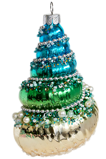 Елочное украшение Ракушка Конча Изумрудный остров выполнено из стекла, декорировано блестящей переливающейся крошкой, жемчугом и пайетками. Размер 6,5х5,5х11 см