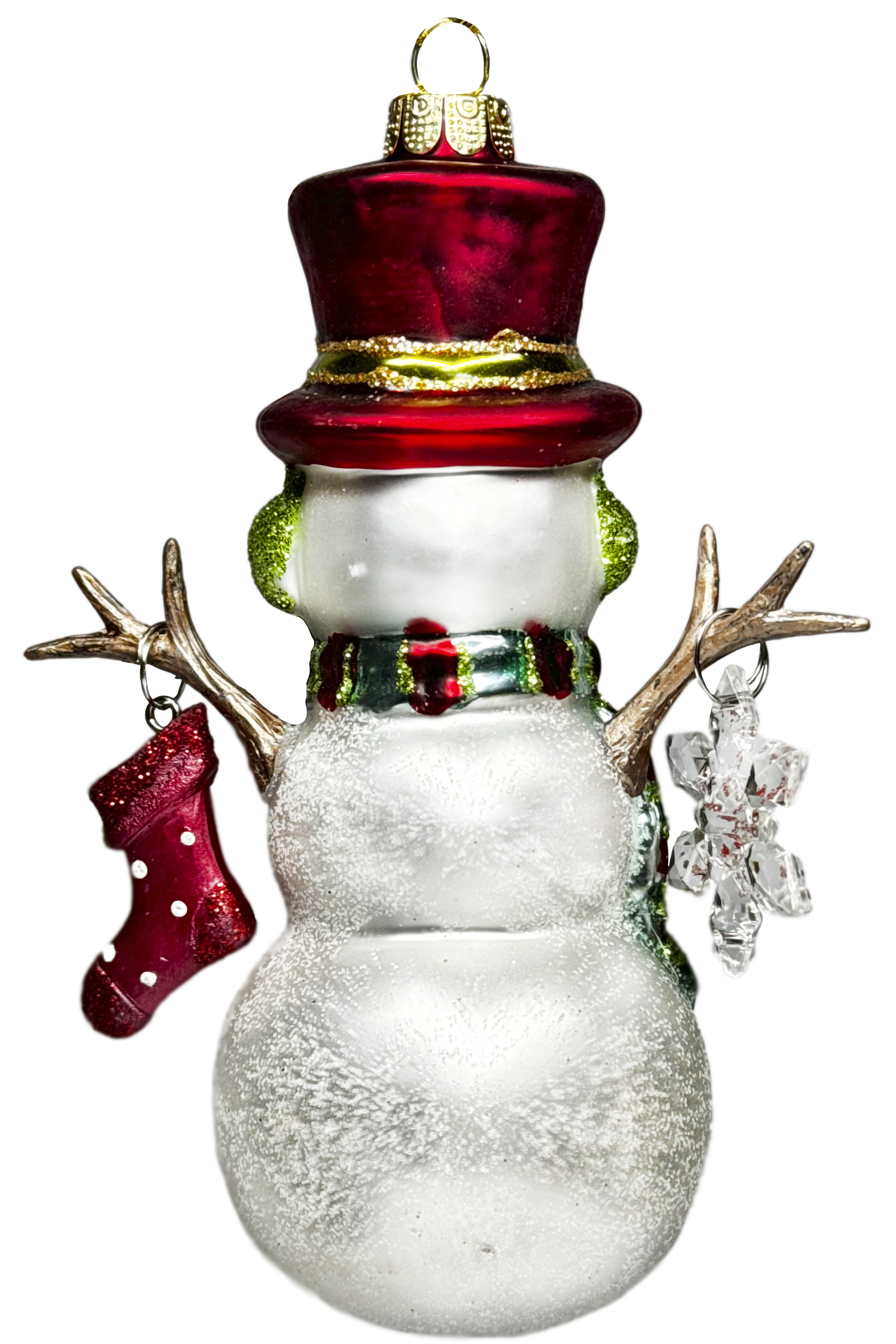 Елочное украшение Снеговик руки-веточки рождественский в красном цилиндре, выполнено из стекла, декорировано блестящей переливающейся крошкой. Размер 7х5х9 см