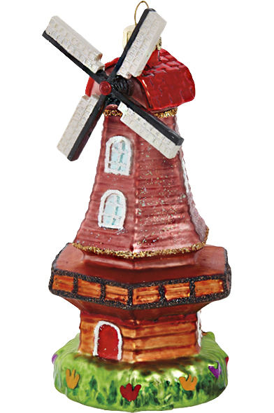Елочное украшение Ветряная мельница, выполнено из стекла, декорировано ручной художественной росписью и блестящей крошкой. Размер 7х7х13 см