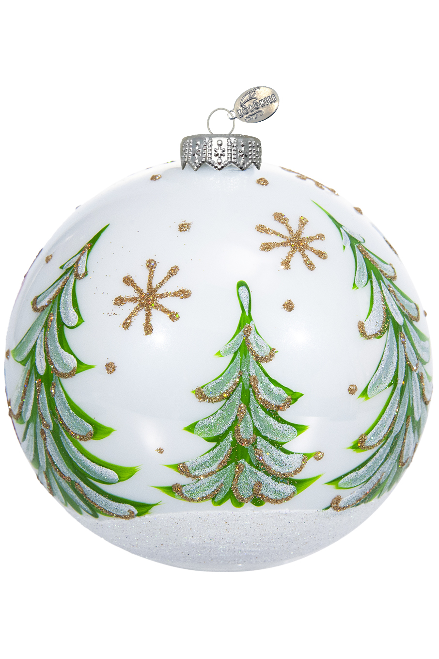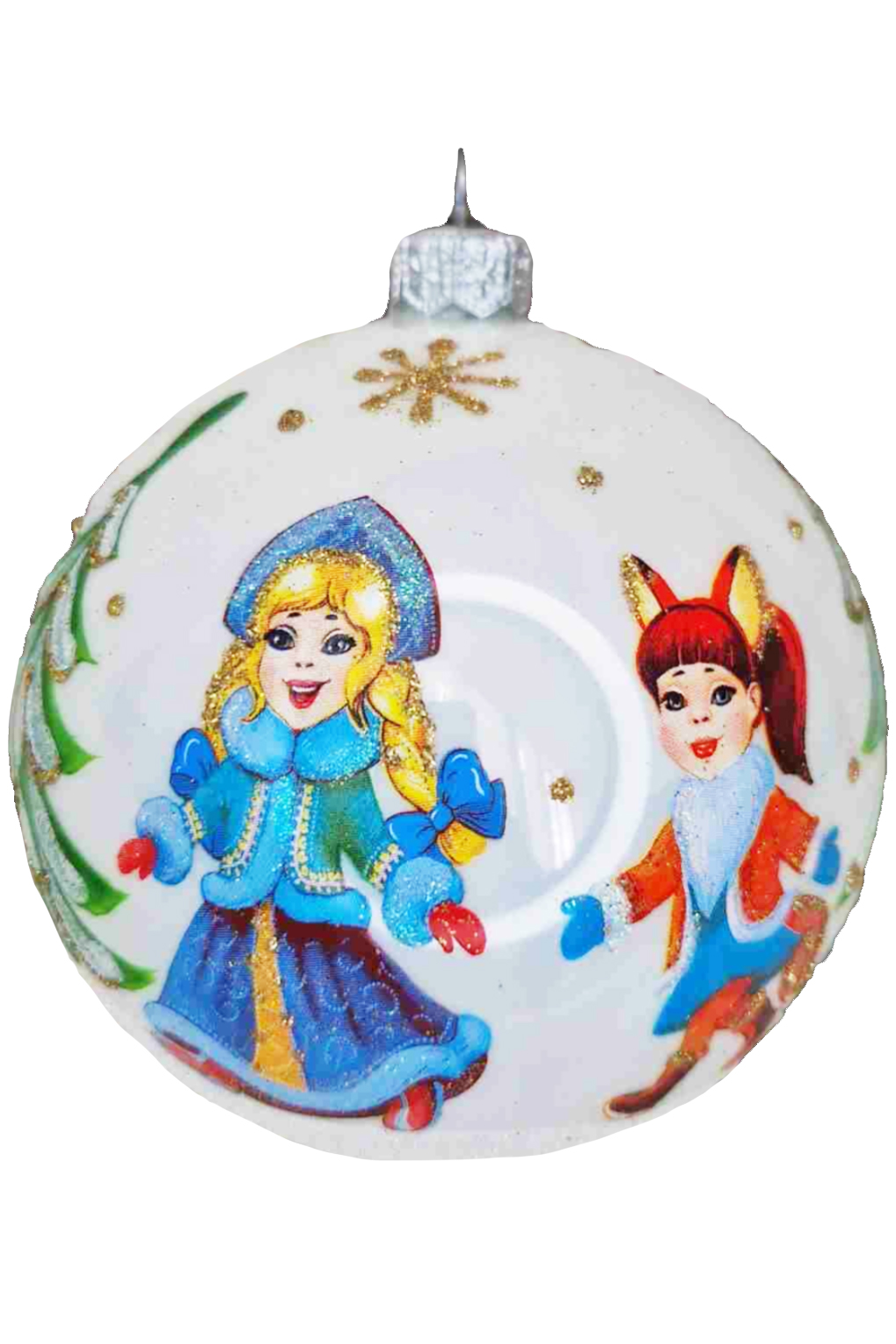Шарик выполнен из белого стекла, декорирован росписью и цветным глиттером. Украшение для удобства имеет ушко для ниточки или крючка. В индивидуальной упаковке. Диаметр 10 см.