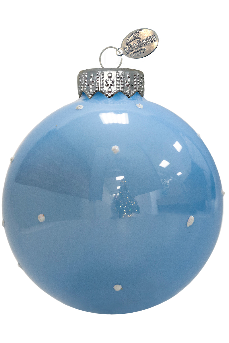 Шарик выполнен из стекла в голубом цвете, декорирован росписью, белым и красным глиттером. Украшение для удобства имеет ушко для ниточки или крючка. В индивидуальной упаковке. Диаметр 8 см.