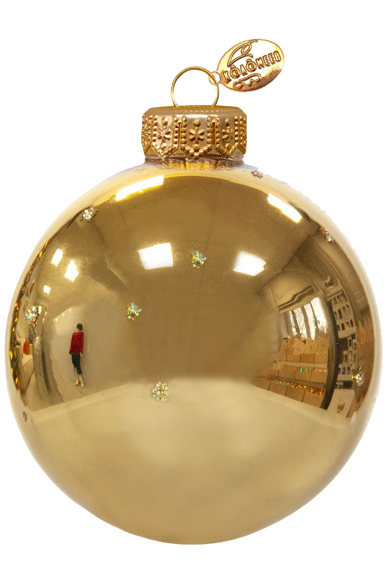 Шар выполнен из стекла, декорирован росписью и блестящей крошкой. Украшение для удобства имеет ушко для ниточки или крючка. В индивидуальной упаковке. Размер 8,5 см.